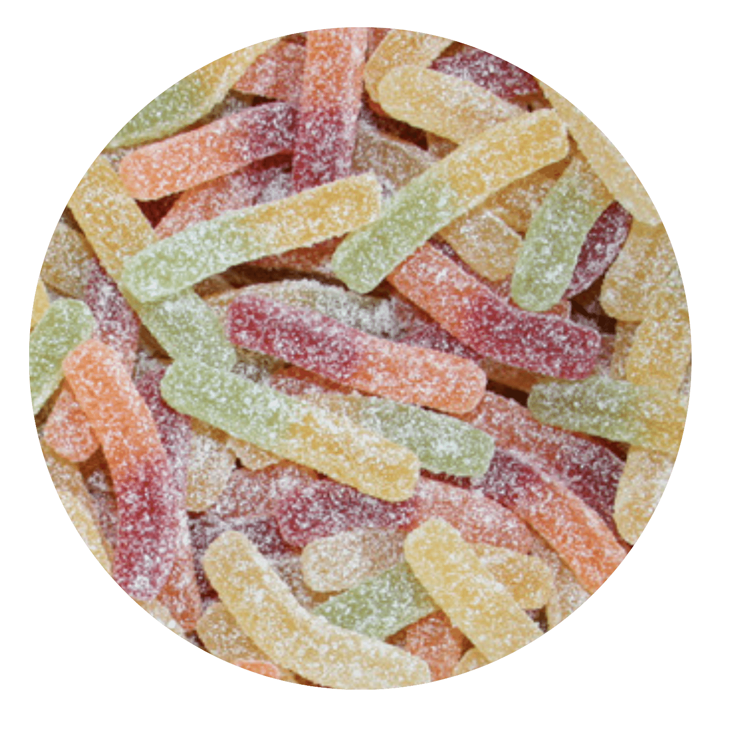 Gelb, orange, rot und grün! Fruchtig-bunte und herrlich saure Fruchtgummi-Stäbchen musst du haben :)