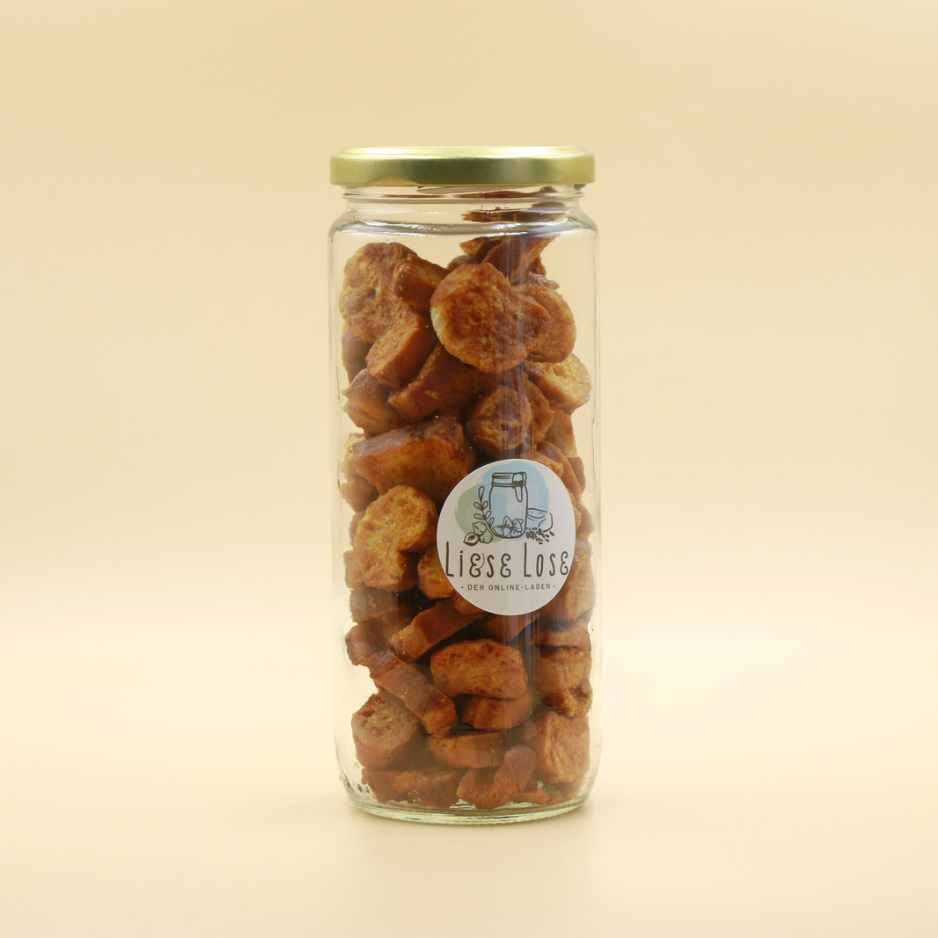 Zutaten: Brezeln* ([Weizenmehl*, Margarine* (Palmfett*, Sonnenblumenöl*, Wasser, Zitronensaft*, Salz), Hefe*, Salz, Weizenkraft* (Weizenmehl*, Weizenquellmehl*, Gerstenmalzmehl*, Rübenzucker*, Acerolasaftpulver*), Dinkelmehl*, Acerolasaftpulver*, Natonlauge*]), Sonnenblumenöl*, Rübenzucker*, Tomatenpulver* 5%, Salz, Aceto Balsamico* (Weinessig*, Traubenmost konzentriert*), Zwiebeln gemahlen*, Knoblauch getrocknet, gemahlen*