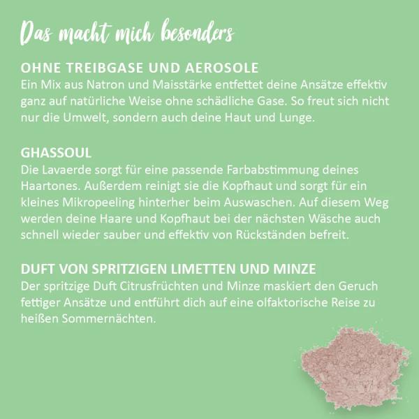 Die Formulierung zum Streuen kommt ganz ohne Gase aus. Eine Mischung aus Natron, Stärke und Tonerde bindet Fett effektiv und mattiert den Ansatz, ohne die Haare auszutrocknen. Der feine Duft sorgt dabei für einen frischen Auftritt. Trockenshampoo ist kein Ersatz für die Nasswäsche. Du solltest nicht mehr als 1-2 Tage bis zum Haarewaschen damit überbrücken.