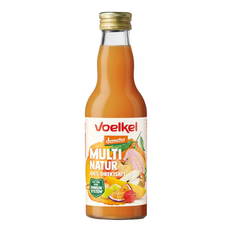 Zutaten: Orangensaft** 27,5%, Apfelsaft** 27,5%, Möhrensaft** 15%, Traubensaft** 10%, Birnensaft** 4%, Mangomark** 4 %, Bananenmark*, Acerolakirschmark* 2,5 %, Passionsfruchtsaft* 2,5 %, Guavenmark** 2%, Zitronensaft**.